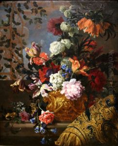 Carnations, Parrot Tulips, Poppies, Morning Glory And Other Flowers In A Sculpted Urn On A Ledge