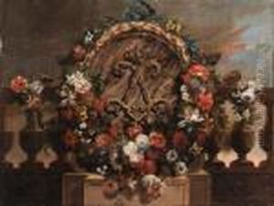 Roses, Tulips, Hyacinths And Other Flowers In A Woven Basket, With Grapes And Two Mallards, In A Landscape; And Roses, Anenomes, Hyacinths And Other Flowers Draped On A Stone, With Plums In A Woven Basket And Two Rabbits In A Landscape - Overdoors