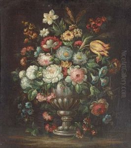 Carnations, Parrot Tulips, Poppies, Morning Glory And Other Flowers In A Sculpted Urn On A Ledge