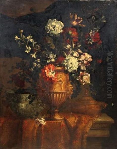 Nature Morte Au Bouquet De Fleurs Dans Un Vase Antique, Vase En Porcelaine De Chine Et Pot A Huile Oil Painting by Jean-Baptiste Monnoyer