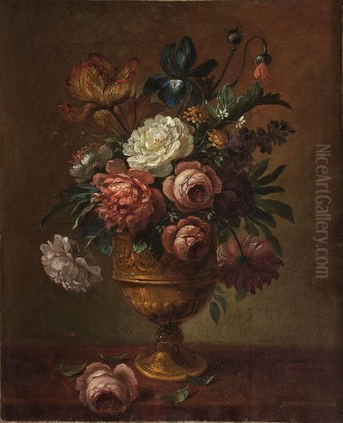 Nature Morte Au Bouquet De Fleurs Sur Un Entablement.
