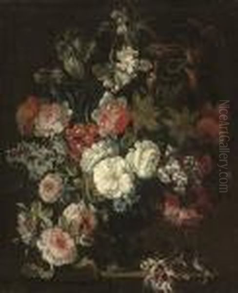 Roses, Chrysanthemums, An Iris, Dianthus And Other Flowers In Anurn On A Stone Ledge