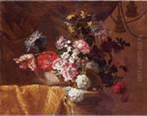 Still Life Of Hydrangeas, Convolvuli, Peonies And Other Flowers In An Urn On A Draped Stone Ledge