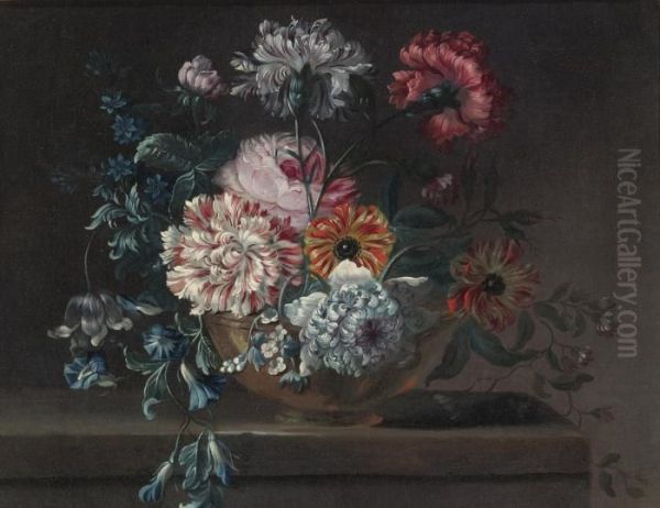 Still Life Of Variegated Carnations And Other Flowers On A Ledge