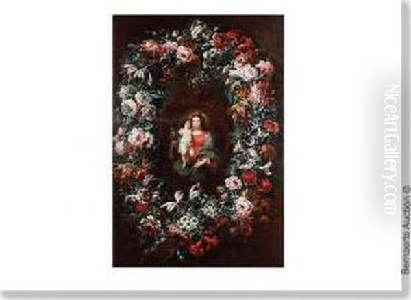 La Vierge A L'enfant Entouree D'une Couronne De Fleurs.