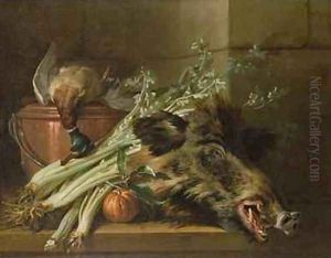 A Dead Mallard, a Boars Head, Celery and a Copper Pot on a Ledge