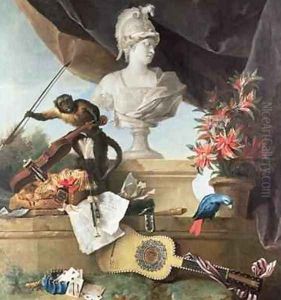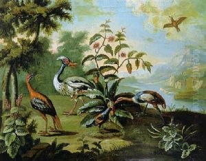 A Macaw, Doves And Monkies In A Classical Landscape