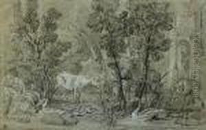 A Wooded Landscape With Cattle And Sheep, A Statue In The Clearing Beyond