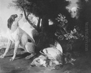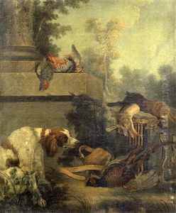 A Dead Hare, A Pheasant, A Young Partridge, A Jay And Other Game By A Plinth, A Landscape Beyond