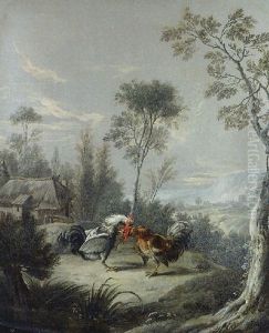 Two Cockerels Fighting In A Landscape