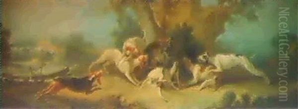Hounds Attacking A Wolf In A River Landscape