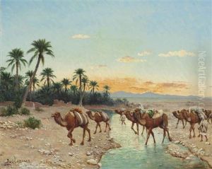 Kamelkarawane Bei Der Tranke An Einem Wadi-flusslauf In Der Wuste
