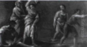 A Rocky Mediterrenean Coastal Landscape At Dusk With Fishermen Drawing Their Nets And Figures Laying Out Their Catch