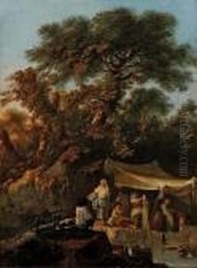 A Pastoral Landscape With Shepherds Resting By A River And Farmbuildings Beyond