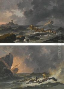 A Mountainous Landscape With Two Foot Bridges And Travelers (+ A View Of The Tagus, Portugal, With Ships And Boats In A Rough Sea; Pair)