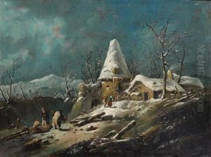 Paysage D'hiver Avec Un Bucheron Fendant Du Bois