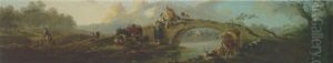 A Mountainous Landscape With Goatherds Crossing A Bridge
