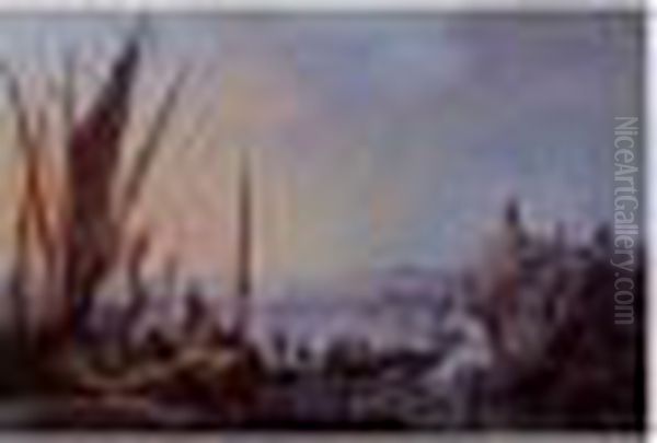 A View Of The River Tagus, Portugal, With Fishermen Drawing Their Nets And Figures Along The Rocky Coast