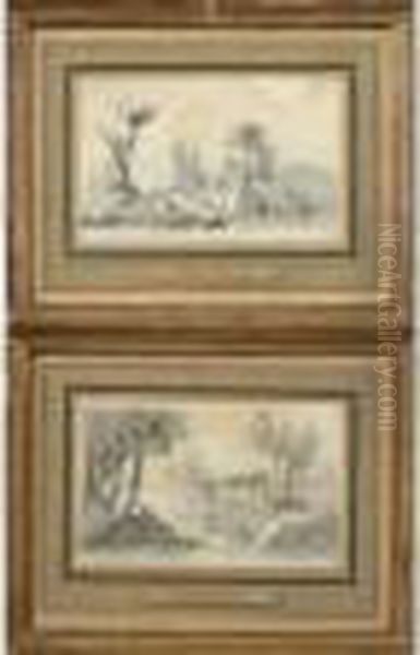 "paysage Aux Lavandieres" Et "paysage Aux Ruines". 10 X 15,5 Cm.