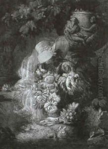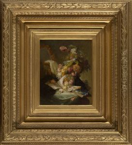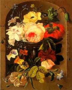 A Flower Still Life In Front Of A Marble Relief Depicting Diana As The Godess Of The Hunt