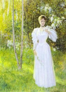 Portrait of a young woman, three quarter length, in a winter park with fur cape, muff and hat