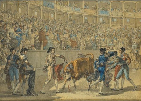 Puntillero Donnant Le Coup De Grace A Un Taureau Dans Les Arenes Royales De Madrid [ ; Puntillero Giving A Death-blow To A Bull In The Royal Arenas Of Madrid ; Pen And Black Ink, Watercolour]