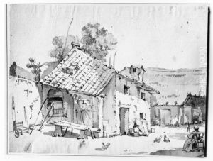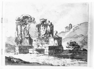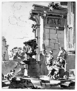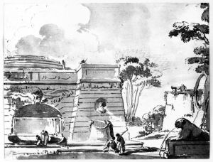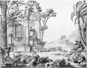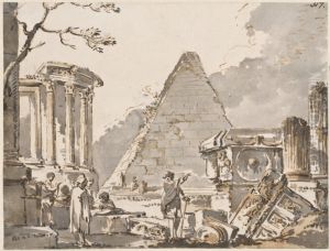 Ruinlandskap med Colosseum, ryttarstaty och Trajanuskolonnen, ca 1756