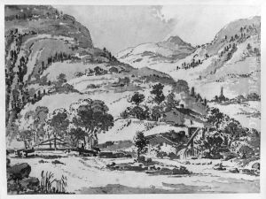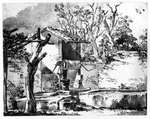 Vy av stora tradgardsdammen med festlokalen pa Karlberg 1770