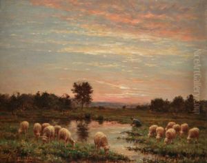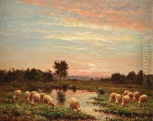 Bergere Et Ses Moutons A La Mare Au Couchant