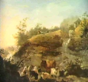 A Rocky Landscape With Shepherdesses Watching Over Their Livestock Before A Waterfall