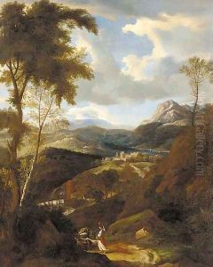 A classical landscape with a woman on a path carrying an amphora, a town beyond
