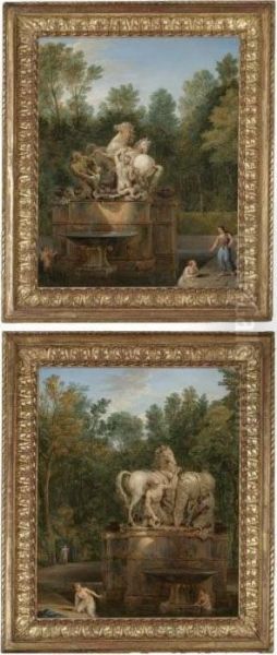 A Pair Of Views Of The Fountains "les Cheveaux De Soleil" At Versailles With Bathers