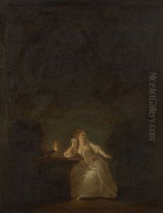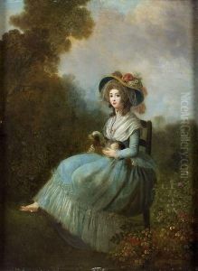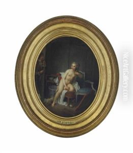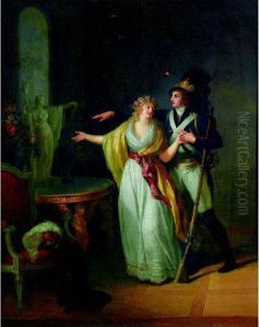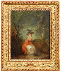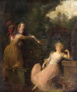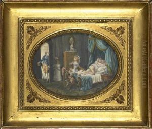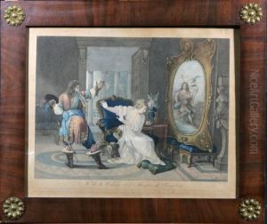A Young Woman Seated At A Poudreuse (dressing Table), With Bird Nest And Cage, A Young Man Hiding Behind A Curtain