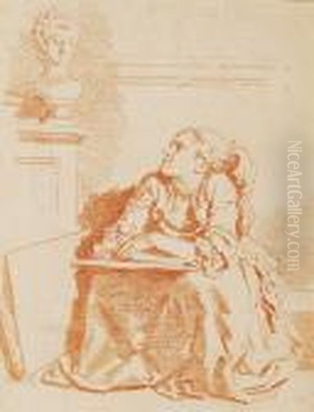 Seated Girl, Leaning With Folded Arms On A Sketchbook, Gazing Up At A Female Bust On A Mantlepiece, A Portfolio Propped Up At Her Side