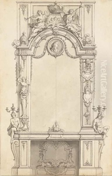 A Design For A Fireplace Below A Mirror Decorated With A Medallionof King Louis Xiv And Two Allegories Of Fortune Holding The Royalcrown Over Two Trophies; The Mirror Flanked With Alternativedesigns Of Candelabra Held By Nudes, The Sides With Trophies And