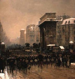 Fete de la Fraternite a l'arc de triomphe de l'Etoile : defile apres la distribution des drapeaux, le soir du 20 avril 1848
