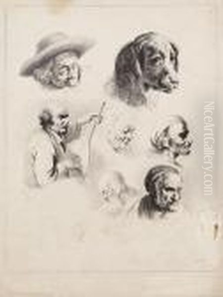 Studienblatt Mit Gitarre Spielender Halbfigur, Mannerkopfen Und Einem Hund