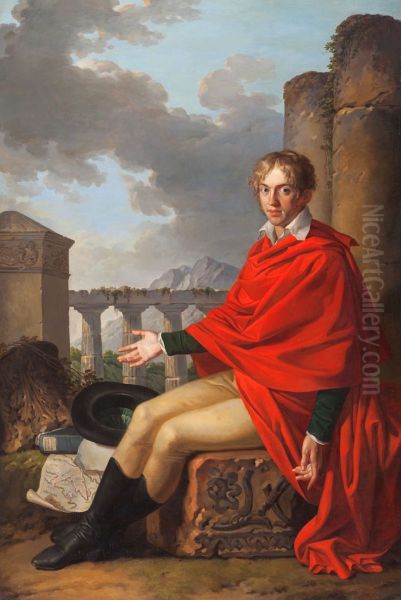 Portrait du comte Nicolas Myelzinski en manteau de voyageur, assis sur les ruines d'Athenes, designees par la tour des Vents.