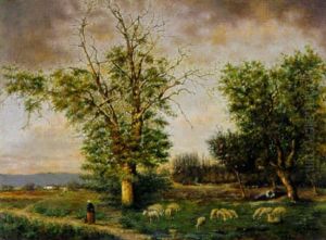 Landschaft Mit Weidender Schafherde Bei Dammerung