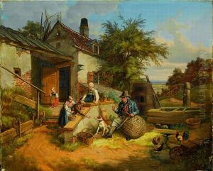 Villagers And Animals In A Landscape Beside A Bridge At The Entrance Of A Village