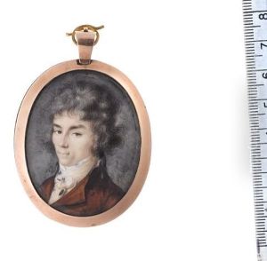 A Gentleman In A Purple Coat With Large Gold Buttons, Pale Blue Waistcoat And Frilled Cravat, Powdered Hair