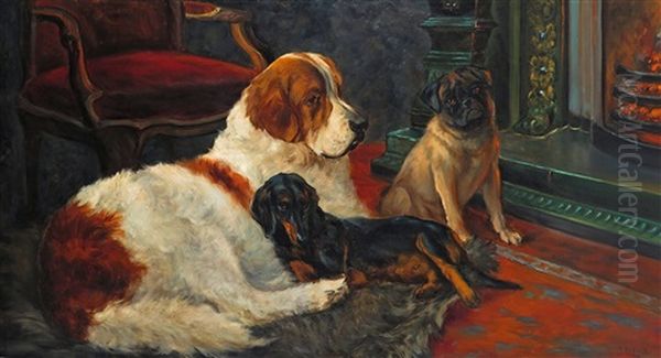 A St Bernard, A Pug And A Dachshund Seated By A Fire