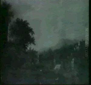 Extensive Landscape With Figures And Animals Outside A Farmhouse, A Stream With A Waterfall