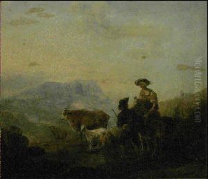 An Extensive Landscape With A Peasant Family And Their Livestock Resting By A Tree