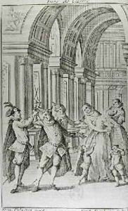 The Baron saluted Candide with some notable kicks on the breech and drove him out of doors