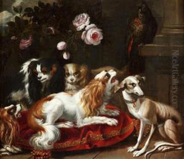 Perroquets Surveillant Des Levriers Et Un King Charles