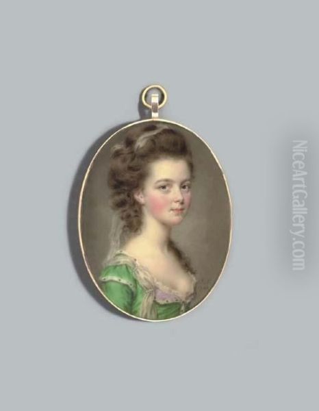 Mrs Russell, Nee Cox, In Lace-bordered White Under-dress, Pink-lined And Ermine-bordered Bright Green Dress, Jewelled Pendant Fastened At Corsage, Gauze Scarf Entwined In Her Upswept And Curling Light Brown Hair And Fastened To The Border Of Her D