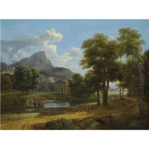 A Mountainous Landscape With Figures By A Lake Before A Classical Temple