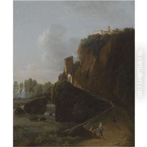 A Landscape With A Waterfall And Figures On A Path Leading To A Hill-top Town, Possibly Montecassino