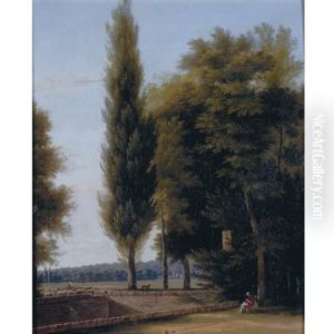 A Sunken Garden With A Girl And A Statue (+ A Farmhouse With A Herdsman Watering His Cows; Pair)